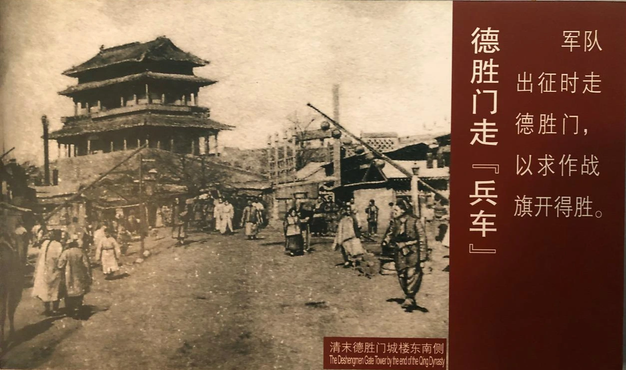 “덕승문(德胜门/더셩먼)은 원나라 때 건덕문(健德门)으로 불렸다. 과거 전쟁터로 나가는 출병의 문이었으며, 승리를 기원하는 의미를 갖는다. (得胜=’승리하다’와 같은 발음) 1915년 옹성(翁城)과 갑루(闸楼)가, 1921년 성루(城楼)가 철거되었다. 1980년 전루(箭楼)에 대한 전면적인 보수를 진행하여, 1982년 완공, 문화재로 지정 후 대외 개방하였다. 1993년 전루 내부에 고대화폐전람관을 설치하였으며, 2006년 전국중요문물보호단위로 지정되었다.’’