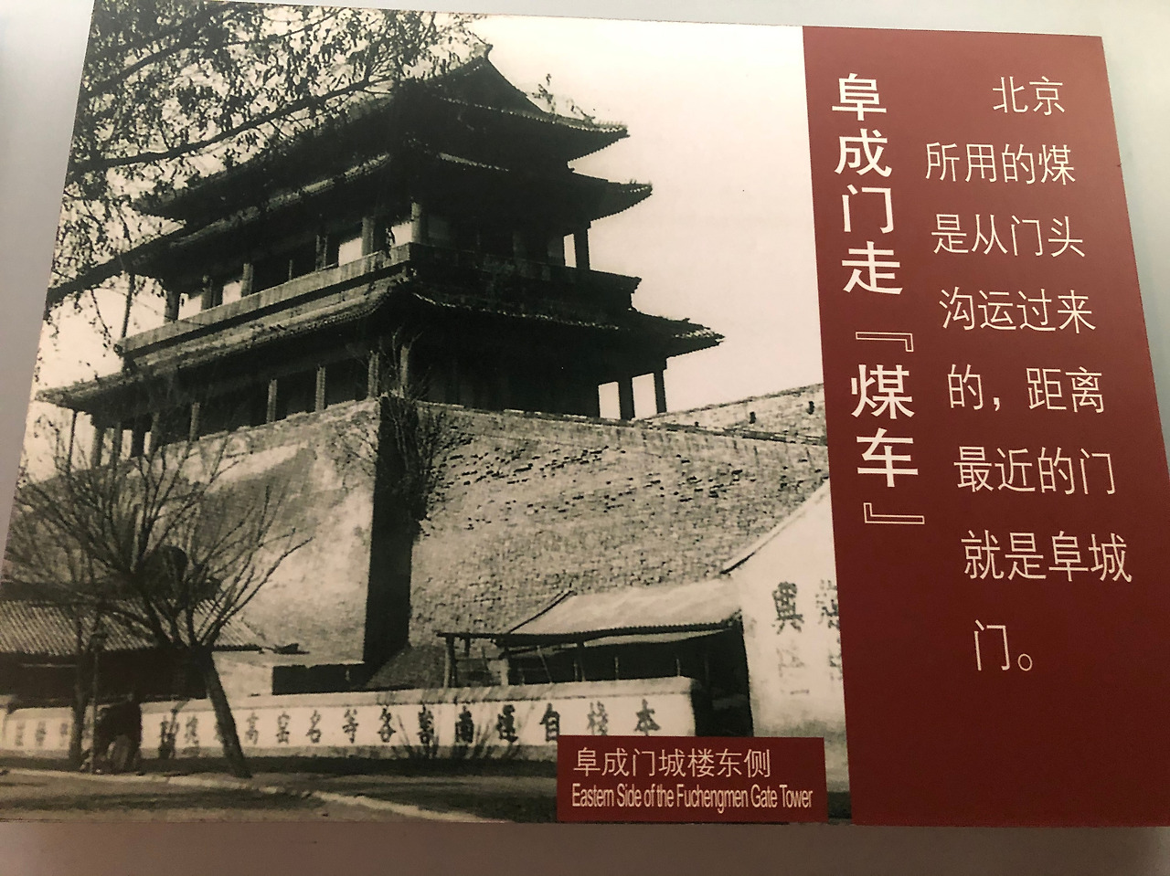 “부성문(阜成门/푸청먼)은 원나라 때 평칙문(平则门)이라 불렸으며 명나라 때 개명했다. 성 내에서 사용되는 석탄은 서쪽 먼터거우(门头沟)에서 생산되며 북경으로 들어오기 위해서는 가장 가까운 부성문을 통해서 운반되었다. 성문 위에는 매화(梅花)가 그려져 있었는데 매(梅,매화)와 매(煤,석탄)의 발음이 동음이의어임을 이용하여 석탄 실은 차가 지나가는 문을 나타냈다고 전해진다. 현재는 모두 철거되고 지하철 2호선 역과 금융거리가 되었다.”