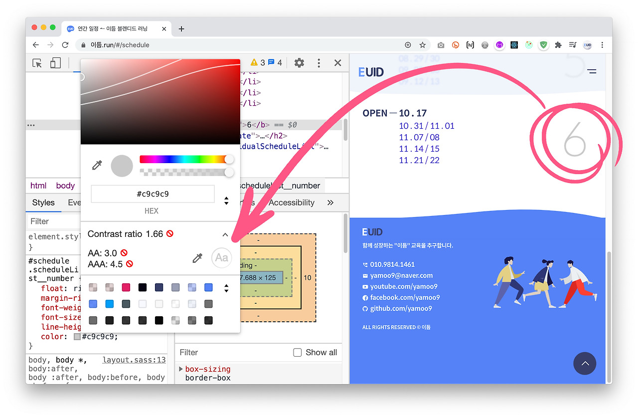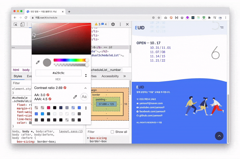 Chrome 개발 도구에서 텍스트를 선택한 후 Styles 패널의 색상(color) 속성에 설정된 값 옆의 작은 사각형(◼︎)을 클릭하면 컬러 피커가 화면에 표시됩니다. 현재 선택된 텍스트의 색상과 배경색의 대비 차 정보는 Contrast ratio 영역에서 살펴볼 수 있으며, 웹 콘텐츠 접근성 지침(WCAG) 성공 기준 1.4.3 최소 대비 차 권장 수준(AA: 3.0, AAA: 4.5 이상)에 미치지 못할 경우 ⊘ 아이콘을 표시해 접근성이 부족함을 알려줍니다.