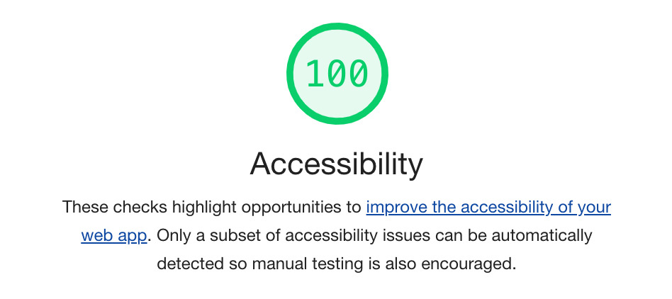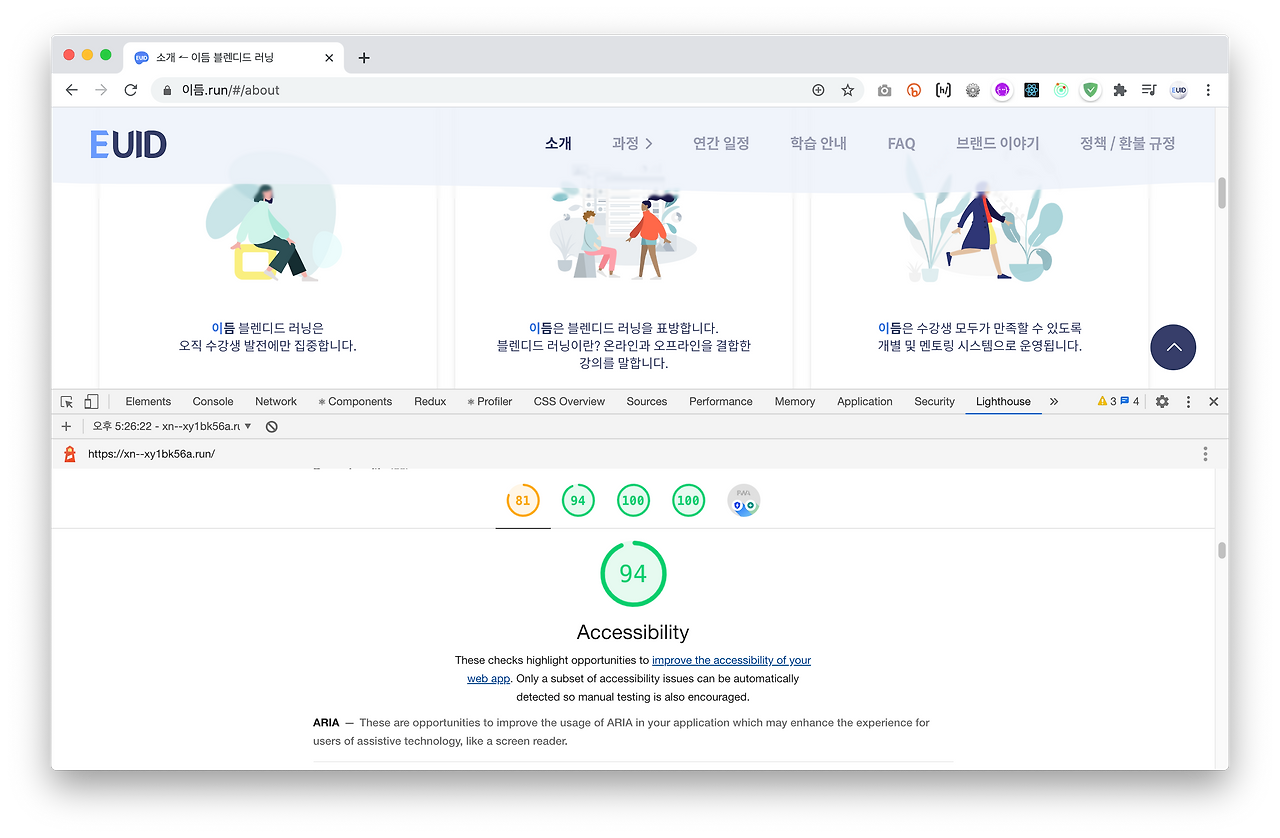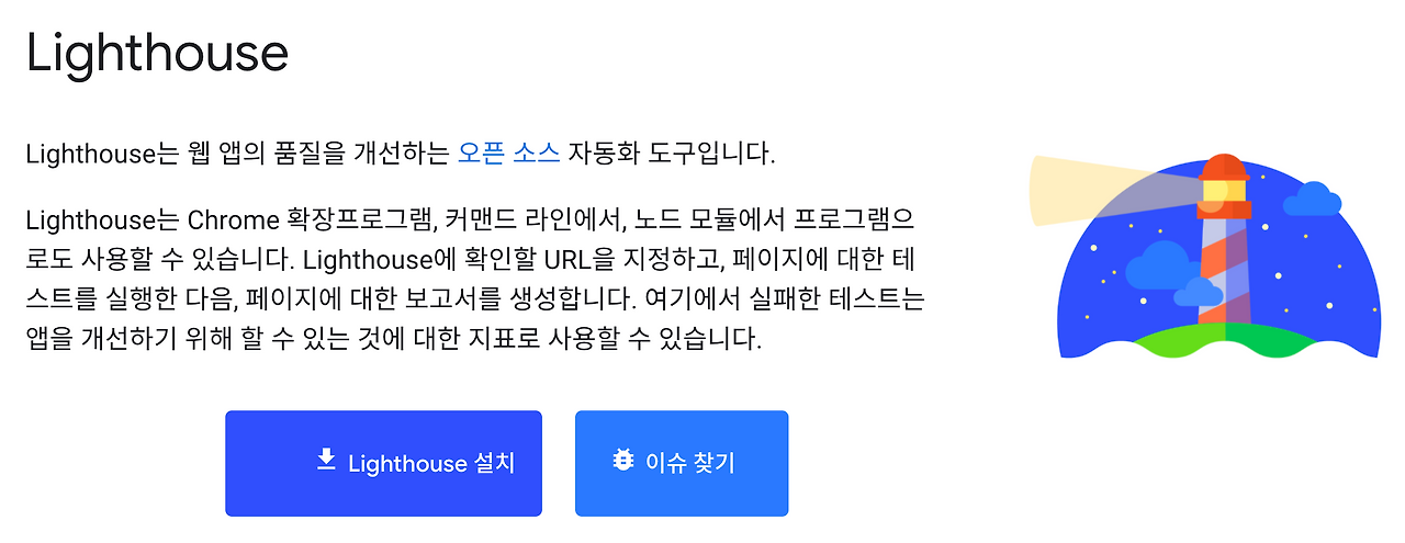 Lighthouse는 웹 애플리케이션의 접근성 또는 보안 문제 등을 진단해 품질을 개선하는 오픈 소스 자동화 도구입니다. Lighthouse와 같은 자동화 도구를 사용한 검사 결과를 개선하면 확실히 애플리케이션 품질(접근성, 보안 등)이 향상되니 Chrome 브라우저에 설치해 사용해보세요.