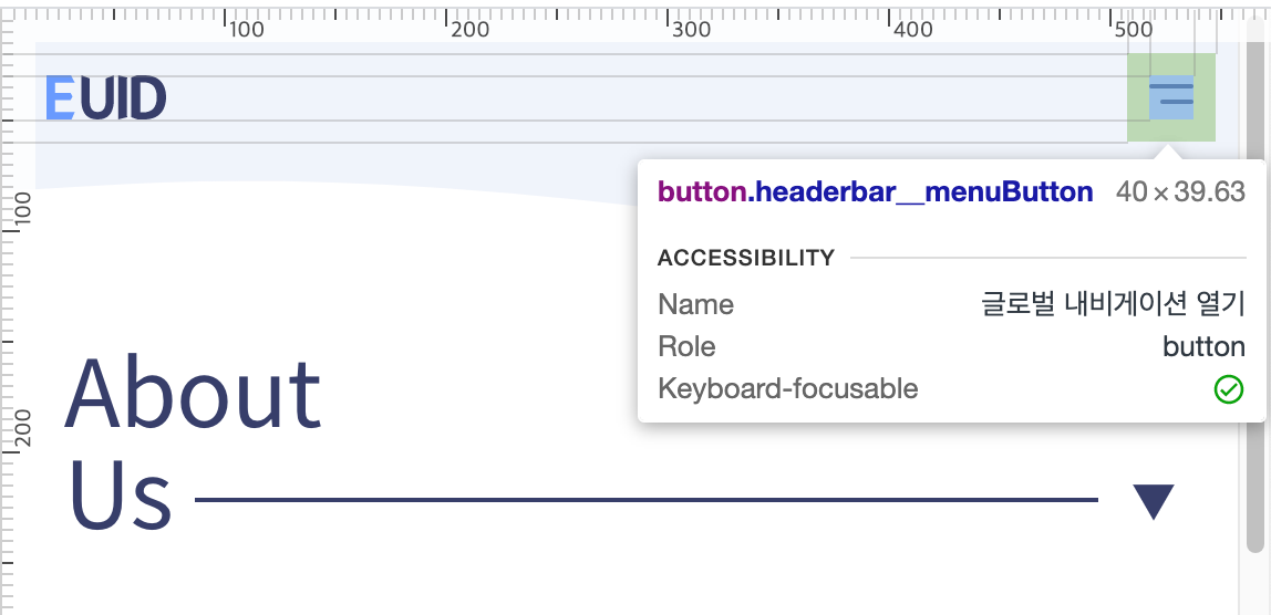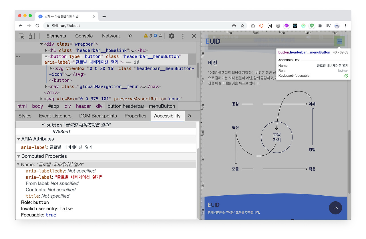 개발 도구에서 DOM 노드를 선택하면 간단하지만 필수적인 접근성 정보를 화면에 툴팁으로 표시합니다. 보다 자세한 접근성 정보를 확인하려면 Accessibility 탭 패널을 선택해 확인할 수 있습니다.