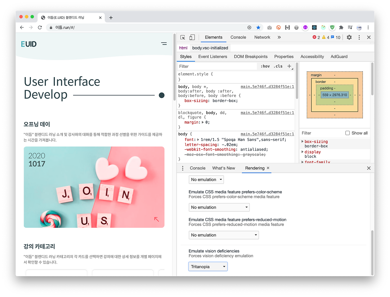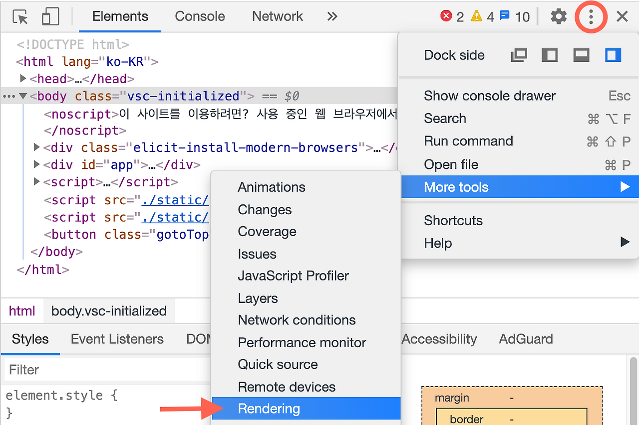 개발 도구의 Rendering 패널을 통해 시각 장애 사용자가 겪는 경험을 간접적으로 체험할 수 있습니다. 개발 도구에서 Rendering 패널을 보려면 Customize and Control DevTools 버튼을 누른 후, More tools > Rendering을 선택합니다.