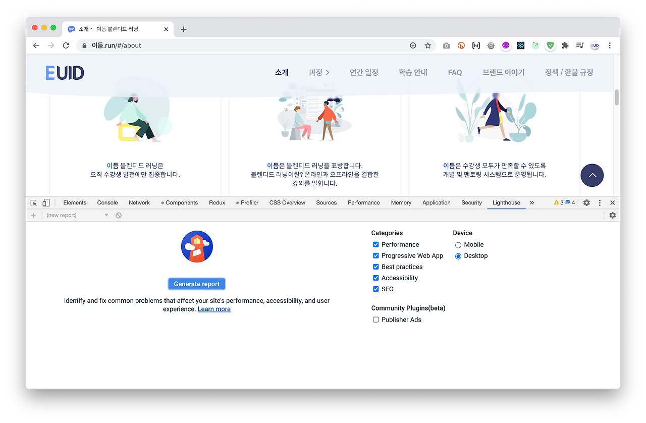 Lighthouse 확장을 Chrome 브라우저에서 설치합니다. 확장을 설치하면 개발 도구에 Lighthouse 패널이 표시됩니다. 검사하려는 항목과 검사 기기를 선택한 후, Generate Report 버튼을 눌러 리포트를 생성합니다.