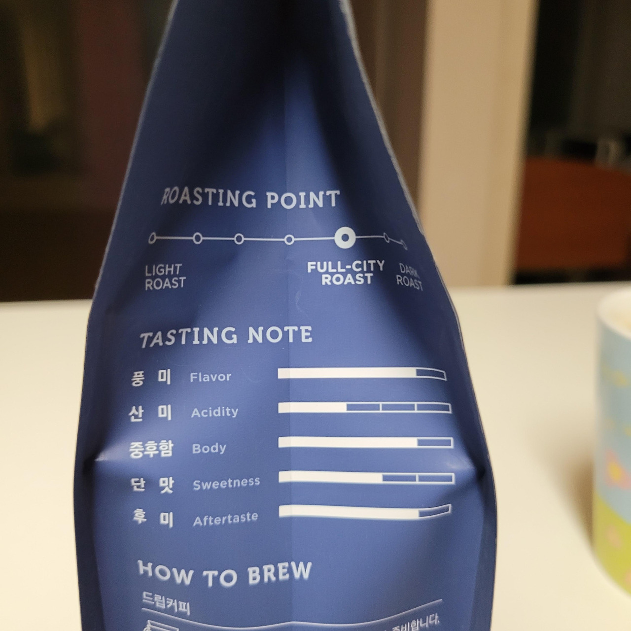 여러분이 그냥 막연하게 아무 지역의 이디야커피를 가서 아메리카노를 시켰을 때 느끼는 그 가장 무난한 맛에서 약간 뭔가가 더 덧대어진 느낌. 그 외에는 이 원두가 주고 있는 느낌이 없을 정도로 이 원두는 간결하다.