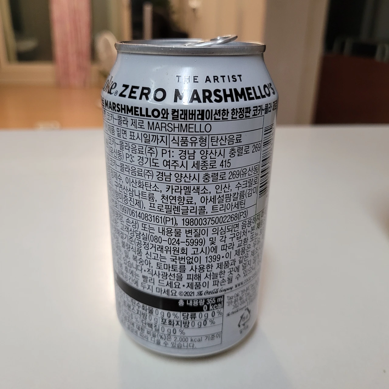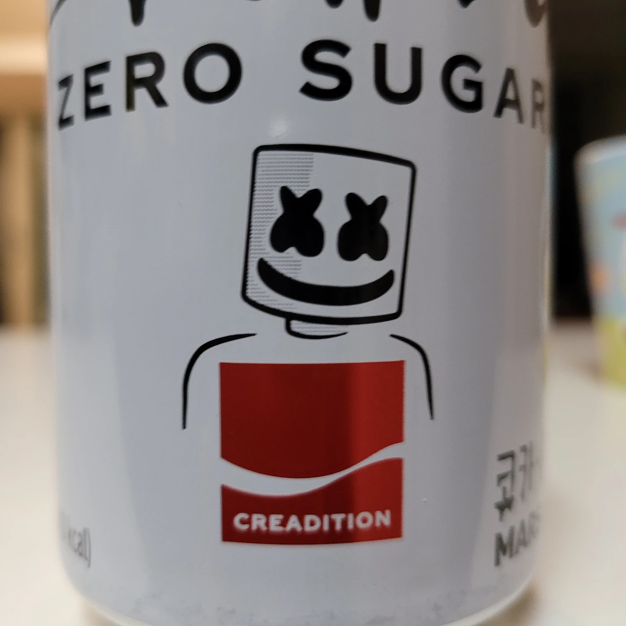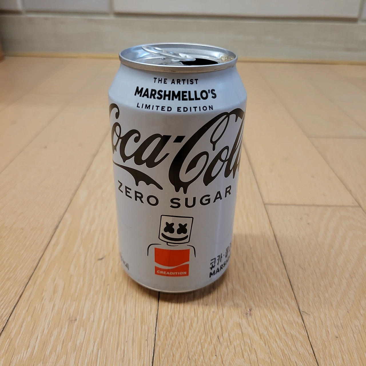 일단 겉 캔에서 아 이게 “마시멜로 에디션” 이라는 느낌이 확 들게 만든다. 그냥 DJ 마시멜로의 캐릭터가 캔에 그려져있는 것에서 “그래요. 이거 한정판이라고요!” 라고 말하는 듯한 진득한 기분을 주게 했다. 처음엔 나도 “이거 그냥 코카콜라 제로에 마시멜로 캐릭터만 캔 디자인에 씌운 거겠지?” 라고 생각했으나… 코카콜라 크리에디션이 붙은 거에서 느꼈다. “아, 이건 뭔가 또 코카콜라가 콜라에 딴짓을 했겠구나…”
