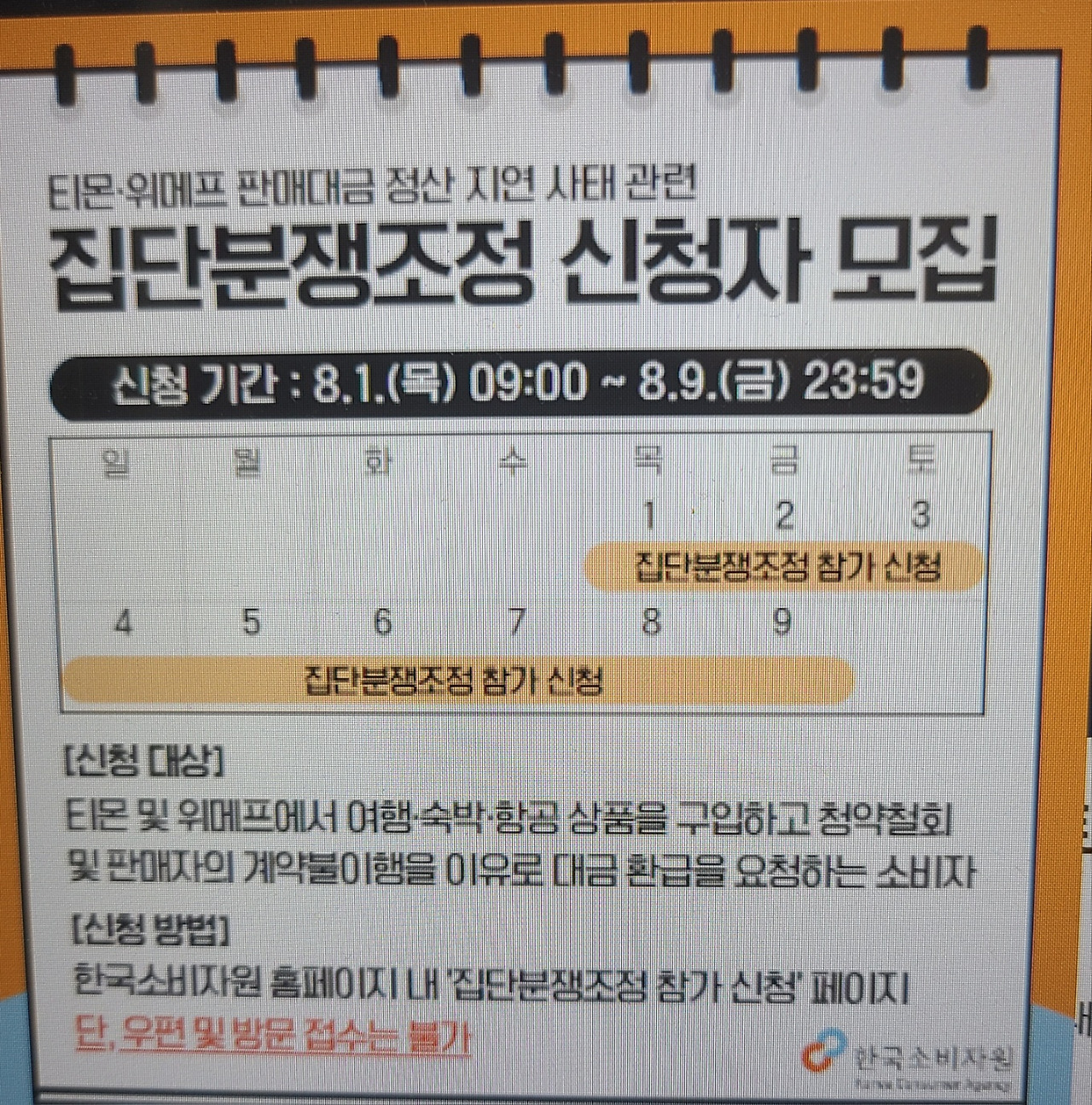 집단 분쟁조정신청자 모집/ 집단조정신청자는 8월 1일부터 8월 9일까지 참고 바란다. <화면 갈무리>