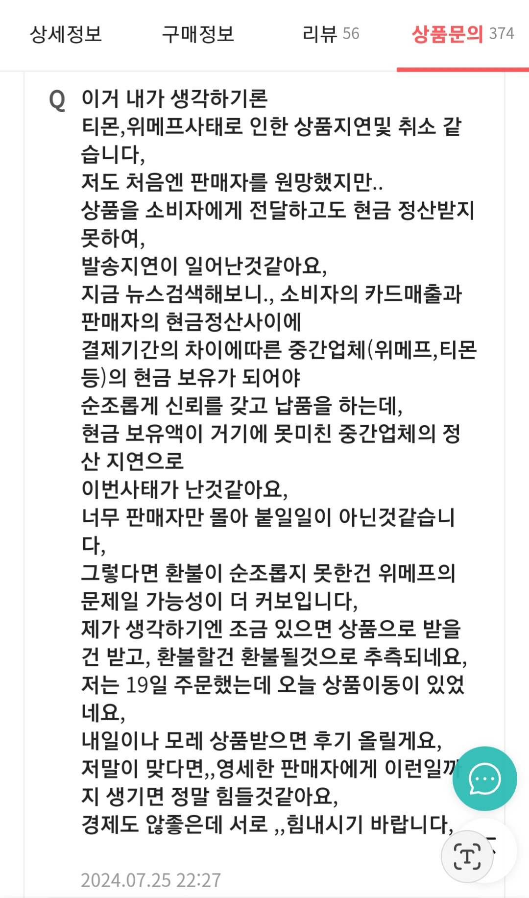 티메프 사태 후, 뉴스에서 보도되는 안타까운 판매자측에 잇다른 부도 소식이 전해지자 샌들을 판매했던 사이트에는 판매자를 비방하는 글 위로, 늦었지만 받은 구매자들이 샌들에 하자가 있어도 그대로 신겠다는 리뷰와 함께 판매자를 응원하는 글들이 올라오기 시작했다. 그리고 지금 이 사태는 판매자의 문제라기보다는 판매자와 소비자의 중간업체 위메프, 티몬의 정산 지연으로 이번 사태가 발생한 것 같다. 너무 판매자만 몰아 붙일 일이 아닌 것 같다라는 글들이 올라왔다.
