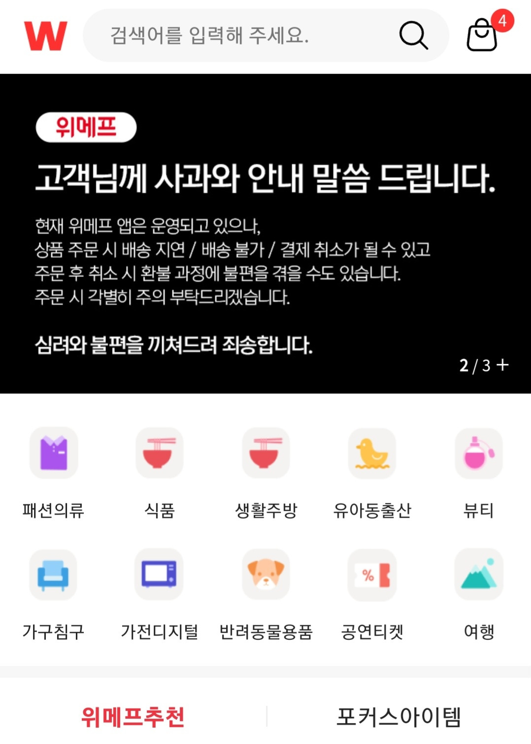 위메프 사이트/사과와 안내의 글이 올라와 있눈 우미페 메인 화면<화면 갈무리>