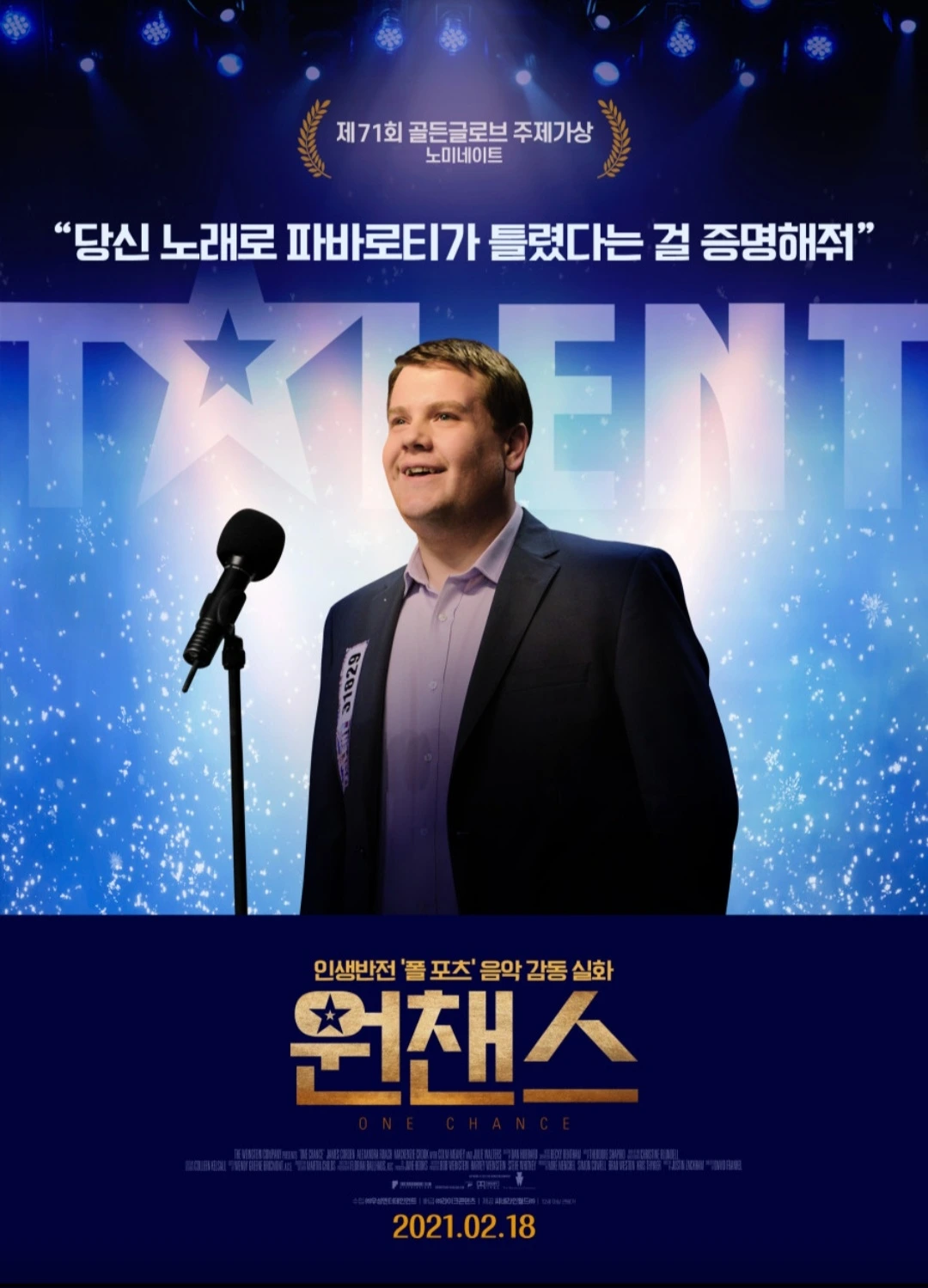 ‘원챈스’ 폴포츠가 브리튼즈 갓 탤런트의 우승하기까지의 과정을 영화로 만든 작품이다. ‘꿈은 노력하게 만들고 노력은 꿈을 가능하게 만든다’라는 문장을 나오게 한 그의 원동력은 무엇일까가 궁금해 찾아보게 됐다.