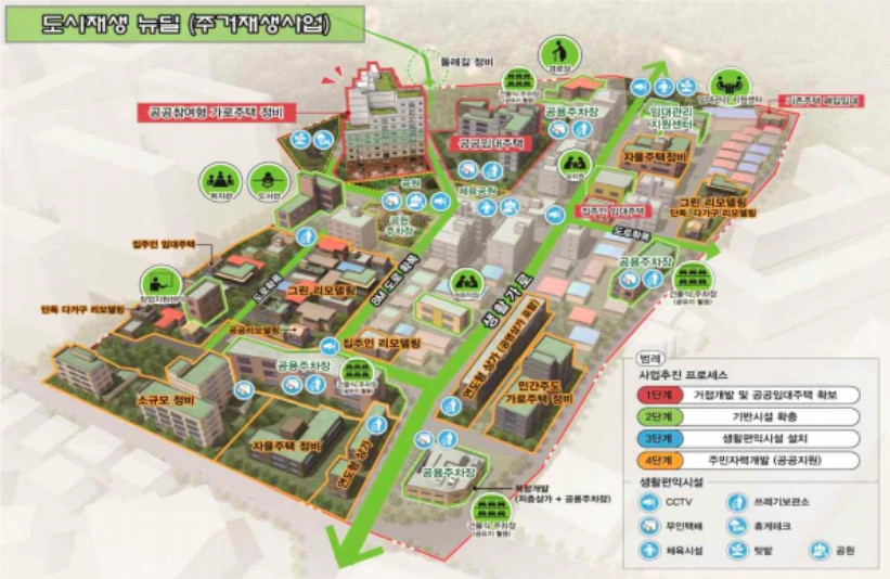 이 방식은 위의 그림처럼 거점 개발 방식을 핵심 내용으로 담고 있다. 공공참여형 가로주택 정비사업을 통해 일부 지역은 ‘소규모 재개발'을 추진하는 동시에 공공임대주택을 확보하고, 도로 등의 기반시설을 확충하는 것이 골자다. 이를 거점으로 삼아 이 지역의 나머지 공간은 집주인들이 개별로 리모델링을 시행하도록 유도하는 식으로 주거지 개선이 이뤄지는 모델이다.