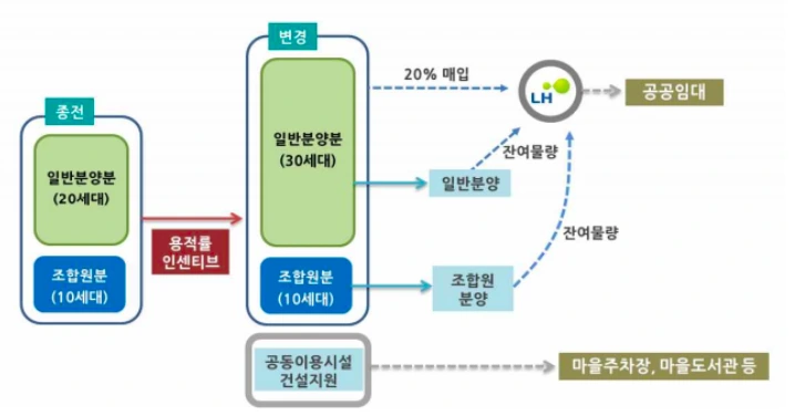 20% 공공임대주택 확보 조건을 정부와 약속하게 되면 법적 상한까지 용적률이 완화되는 ‘인센티브'를 받을 수 있다. 또 주택도시기금을 통해 초기사업비와 건설비를 저리로 융자 받는 혜택도 얻게 된다. LH 등 공기업은 일반분양분 중 20%를 공공임대주택 용도로 매입하되, 나머지 일반분양분 중에서도 잔여물량이 생길 경우 매입해 역시 공공임대주택으로 활용하게 된다. 아울러 정부는 건물 하층부의 공용시설을 활용해 마을주차장과 마을도서관, 어린이집 등 지역주민이 원하는 공간도 만들어낼 수 있다고 소개하고 있다.