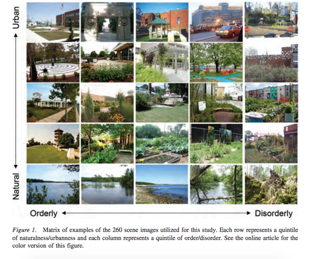 연구자들은 온라인 노동시장 사이트인 Mechanical Turk를 통해 105명의 참가자를 선발한 뒤, 이들에게 자연환경과 도시환경에 대한 다지털 이미지들을 보여줬다. 평온한 자연 풍경, 조용한 동네 거리, 헝크러진 숲, 버려진 창고 등...