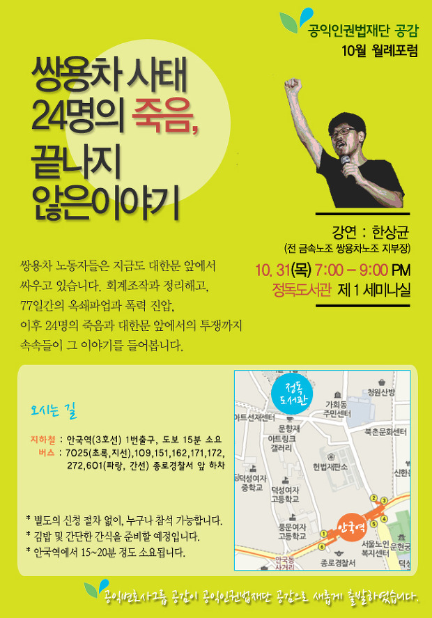 사실 이 연두색 포스터를 제가 100% 다 만든 건 아니고, 포토샵 하나도 모르던 제가 호기롭게 도전해본다고 해서 60% 정도 만들고, 그다음에 저보다 잘하는 같은 월례 포럼 준비팀 언니가 나머지 40%를 수정, 보완해서 최종 포스터가 완성되었습니다. 진짜 포토샵 전혀 모르던 제가, 열심히 포토샵 기능들 검색하면서, 더듬더듬 처음으로 무언가를 완성시켰다는 점에서 의미 있는 프로젝트였어요.