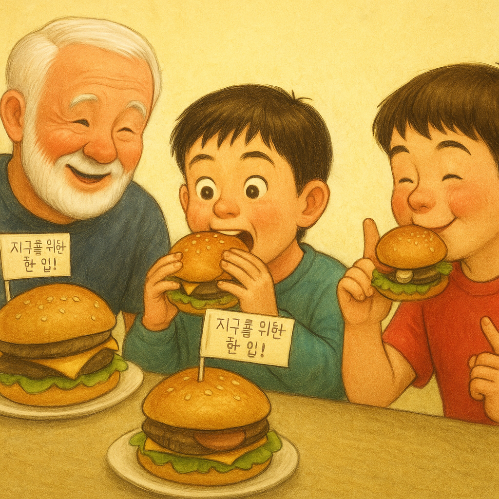 버거 위에는 ‘지구를 위한 한 입!’이라고 적힌 깃발이 꽂혀 있었다.