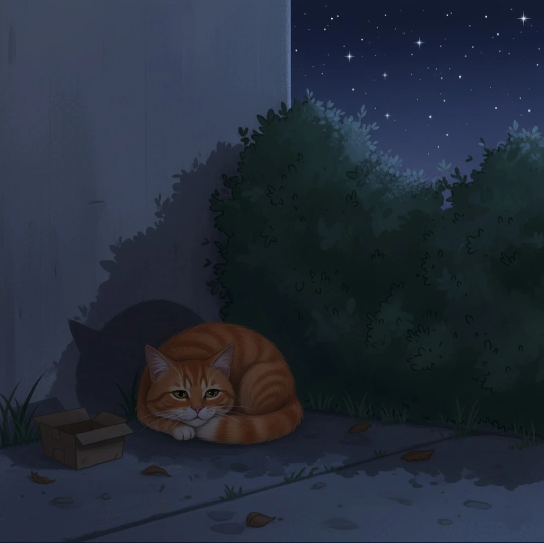하지만 해가 저물고 차가운 어둠이 깔리면, '대장' 구마도 그저 한 마리의 외로운 고양이가 될 뿐이었습니다. 따뜻한 보금자리도 그를 기다리는 가족도 없었습니다. 그는 아무도 없는 아파트 구석 차가운 시멘트 바닥 위에서 몸을 웅크린 채 잠이 들었습니다. 밤하늘의 별들이 쏟아져 내리는 것처럼 외로운 그의 그림자는 더욱 길게 드리워졌습니다. 강한 대장냥이의 겉모습 뒤에는 누구에게도 보여주지 않는 쓸쓸함이 자리하고 있었습니다.