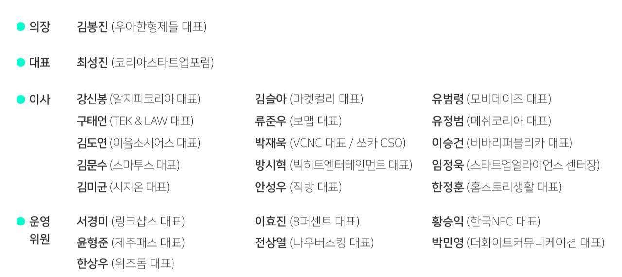 · 특별회원으로 6개의 기업(네이버, 카카오, 카카오모빌리티, 우리은행, KG이니시스, 나이스페이먼츠)이 스타트업 지원활동을 함께하고 있습니다.
