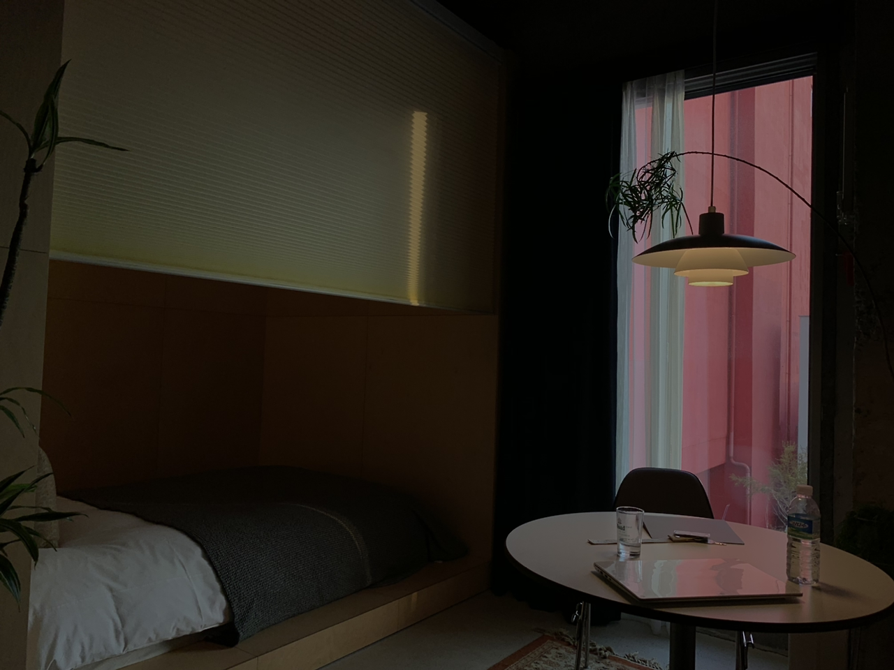 저녁이 되어 바깥을 나가 볼 생각을 했다. 바로 앞 쏘카 존이 있어서, 차를 빌려 동문시장에 갔다. 김밥 한 줄 사 먹고 바닷바람 좀 쐬고. (요새는 시력이 많이 떨어져 밤 운전을 거의 안 하기 때문에) 일찍, 이 사랑스러운 방에 다시 들어왔다. 맥주 한 캔을 마시고 라운지에 홀로 앉아 음악을 들었다. (모기의 습격이 엄청났음) 마주치는 매니저께서 추우면 긴 팔 옷을 주시겠다고, 세심하게 챙겨주는 게 여느 호텔과는 사뭇 다른 인상을 남겼다. 잘 때, 블라인드를 내려 공간을 차단할 수 있는데, 이게 정말 아늑하고 포근했다.