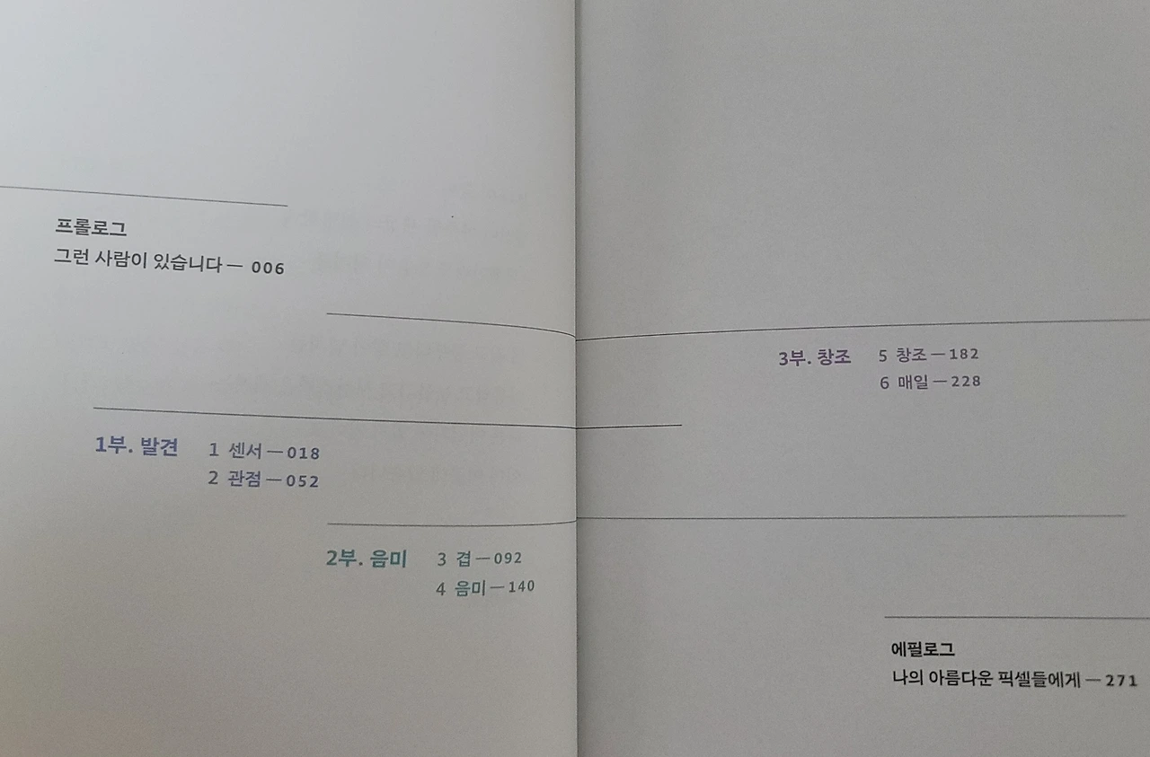 이 책에는 간직하고 싶은 단어와 문장이 유독 많다. 가장 좋았던 부분 중 하나는 챕터의 구성. 일상의 해상도를 높이기 위한 여섯 가지 도구 - 센서, 관점, 겹, 음미, 창조, 매일 - 가 각 챕터를 통해 차근차근 소개된다.