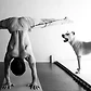 갈색 강아지와 그림을 사랑하는 요가하는 여자.