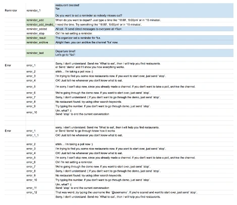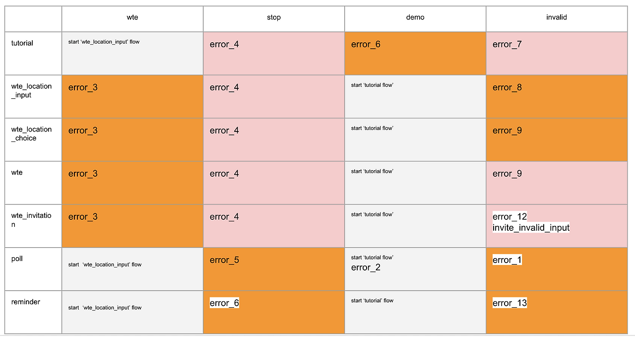 사용자는 챗봇 사용 어느 단계에서든 예상치 못한 반응을 보일 수 있습니다. 예상치 못한 반응이란 챗봇 제작시에 정의한 명령어 외의 모든 반응입니다. 물론 정의한 명령어도 상황에 따라서는 에러가 될 수도 있습니다. 이런 다양한 상황에 대처하기 위해 지금까지와는 다른 방법으로 진행할 필요가 있었고, 저는 아래 표처럼 정리해서 각 상황에 맞는 메시지를 정리하는 게 유용했습니다.