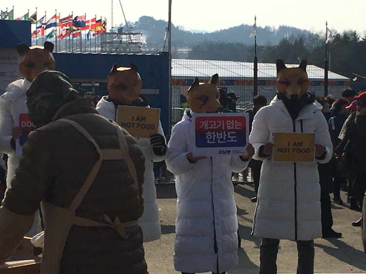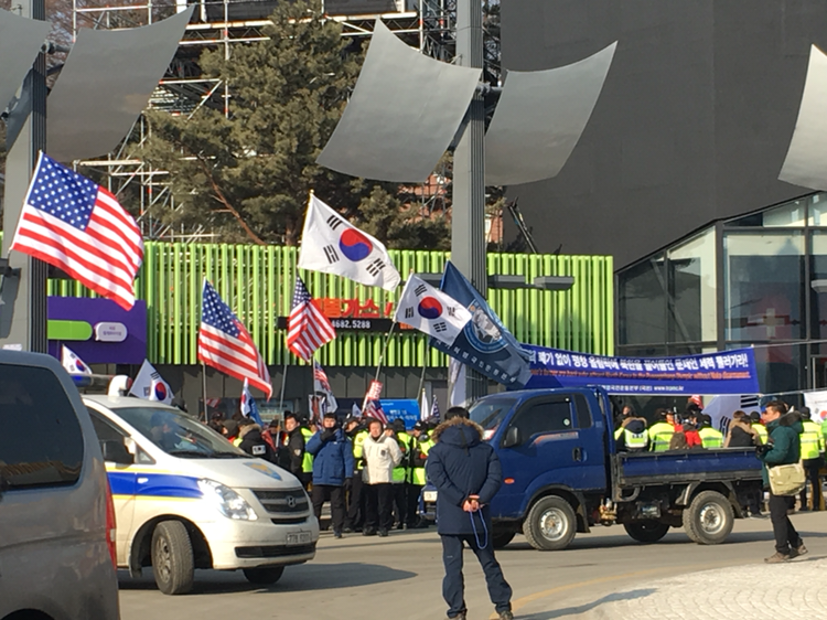 고이 자켓 안에 AD를 넣고 횡계 로터리로 갔다. 봉송로이기도 하고 올림픽 베뉴 근처 최고의 번화가(?)라서 다양한 시위를 하러 나온 사람들이 많았다. 문재인 대통령의 대북 정책을 반대하는 사람들, 전쟁광 트럼프는 물러가라는 사람들, 개고기를 먹지 말자는 사람들. 아마 외국인들은 성조기만 보고 미국 대표팀을 응원하러 나온 사람들이라고 생각했을 수도 있을 것 같다.