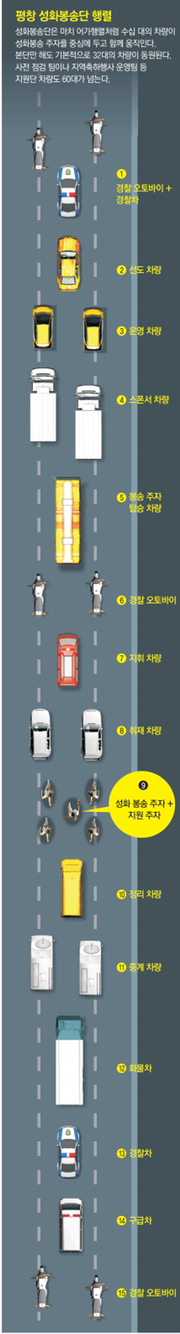 성화봉송 행렬에 대해 동아일보에서 예쁜 이미지와 함께 상세히 다룬 기사가 있어 가져와보았다.