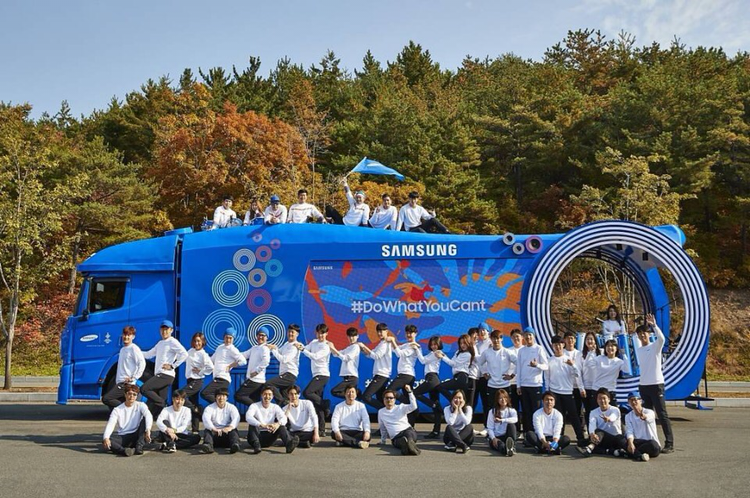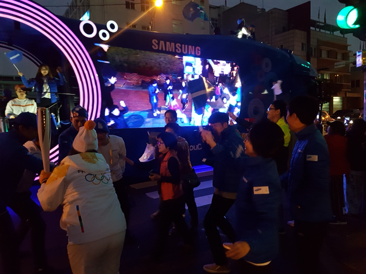 삼성 카라반의 한 가운데에는 LED 스크린이 있다. 다양한 동영상도 나오고 갤럭시 노트 8을 이용해 길가의 시민들을 촬영해 바로 바로 이 스크린에 띄워주기도 한다. 스크린 옆? 뒤?에는 퍼커션이 있고, 거기서 스탭들이 신나게 연주를 한다. 신나는 음악에 맞춰 댕댕 울리는 퍼커션 소리를 들으면 정말로 흥이 난다. 2층도 있는데, 여기서는 사회자가 큰 소리로 주자의 이름 또는 동네 이름을 외치면서 주자와 시민들을 즐겁게 해준다.