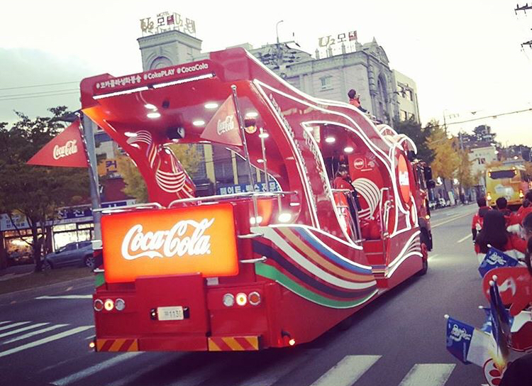 코카콜라는 단층 카라반에, 장식에만 LED를 붙였고 taste the feeling 노래를 계속해서 틀어준다. 이번에 쓰고 있는 한국어판 노래는 굉장히 스윗하다. 카라반에는 코카콜라 스탭들이 항상 10여 명씩 타고 있다가 대기 중인 주자와 시민들에게 콜라 또는 종이 곰 발바닥을 나눠준다. 내 생각엔 노래와 콜라로 일단 좋은 반응을 깔고 들어가지 않나 한다.
