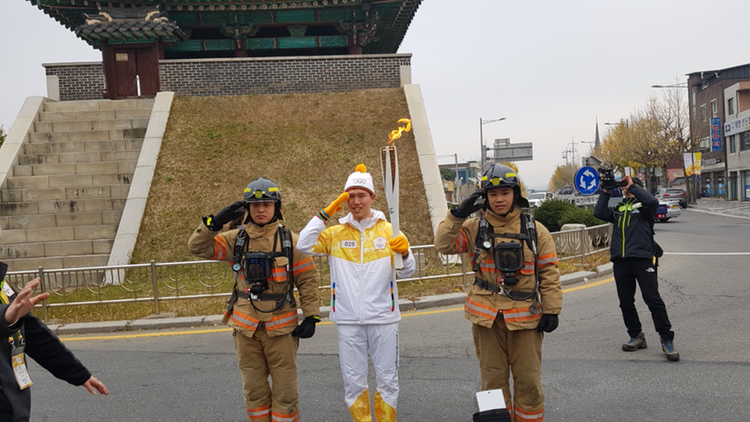 첫 구간 주자 중에는 중앙소방학교에서 교육을 받고 있는 소방간부후보생이 있었다. 동기 2명이 소방관 옷과 산소통을 바리바리 싸들고 와서, 주자와 봉송 전후에 사진도 찍고 봉송 중에는 우리 스탭들과 함께 도보에서 따라 뛰었다. 내년 3월까지 교육이라고 하던데, 잘 마치고 멋진 소방관이 되시길!