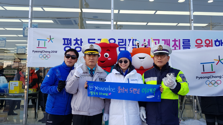 웃고 떠드는 사이 봉송 시간이 가까워졌고 우리 주자님(ㅋㅋ)이 주자 셔틀버스에서 내렸다. 폭설로 카라반이 태안에 오질 못해 황량한 봉송로일 것 같아 걱정을 했는데 카라반 저리갈만큼의 인파가 몰려 도련님 - 어린 시절 사진을 보고 우리가 어제 붙여준 새 별명이다 - 은 놀라면서도 좋아하는 눈치.