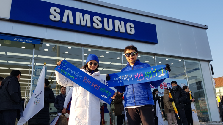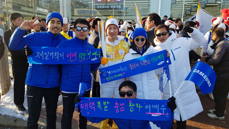 마침 디지털 프라자 앞에서 시작하는 슬랏이었다. 태안에서는 이색 봉송에 이어 2번째 슬랏. 얼마 전 어떤 도시에서 신천지 신도들이 대거 봉송로에 나온 적이 있었는데 그때에 이어 두번째로 많은 인파가 몰렸다 ㅎㅎ 팀원 이름이 적힌 현수막을 들고 돌아다니니 “그 사람이 누구유~? 유명한 사람이유?” 질문 세례를 받았다. 제 직장 동룝니다 ㅋㅋ