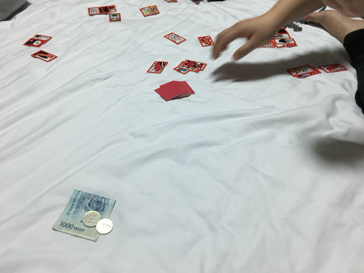 그제가 휴무일이었는데 시간표가 왜 이런건지는 모르겠지만 내일 또 휴무일이다. CP 정리 후 숙소에 복귀해 밥을 먹고나서 주자 운영팀 몇 명이 모여 고스톱을 했다. 내가 보기에 실력이 고만고만한 것 같은데 (나만의 생각인가 ㅋㅋ) 다들 내가 고수고 너는 하수네 하면서 신났다. 나는 천원을 꿔서 치기 시작해 천원을 갚고도 이천 몇백원을 번 상태까지 갔다가 -1,400원에서 끝냈다. 4천원을 꿨다고 생각했는데 화투판에서 번 돈으로 2,600원은 갚고 내 지갑에서는 1,400원만 나갔으니 -1,400원이다. (일기 쓰다가 깨달았다 ㅎㅎㅎ)