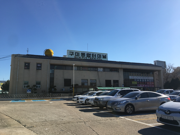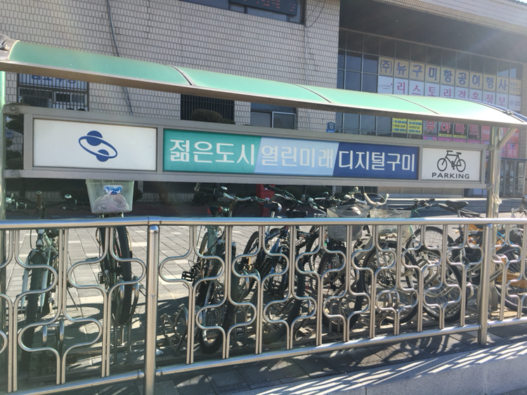 터미널이 아주 옛날 느낌이라 관광객처럼 사진을 찍어봤다. 터미널뿐만이 아니었다. 터미널 앞에 있는 자전거 거치대에는 “젊은 도시 열린 미래 디지털 구미”라는 언제 쓰인지 모를 표어가 쓰여있었다. 폰트와 디자인 모두 표어와 정 반대 느낌 ㅋ.ㅋ