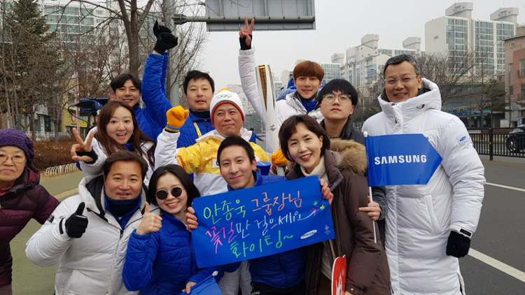 봉송 초기부터 중반까지 우리 삼성 카라반의 MC로 활약하셨던 분도 오늘 깜짝 주자로 나서서 카라반 크루들을 놀래켜줬다. 멋지게 뛰고나서 CP로 복귀하 주자팀과 기념 사진을 찍었다. 역시 MC는 MC인게, 봉송하면서 치는 멘트, 지었던 표정과 포즈 모두 일반 주자들과는 달랐다. MC 노요님 최고예요!