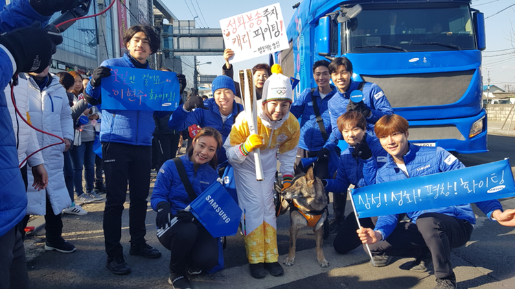 오늘의 주요 주자를 꼽자면 바로 대한민국 은퇴 군견 1호인 캐리의 견주였다. 몇 주 전 왔었던 시각장애인 안내견들에 이어 두번째로 봉송로를 달리게 된 개다.