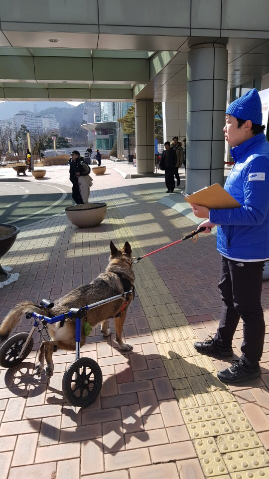 캐리의 견주는 봉송일 전까지 꽤나 걱정을 많이 하셨다. 캐리가 뒷다리가 불편해 개 휠체어를 타는데, 그 휠체어를 탄 캐리가 조직위 버스에 탈 수 있겠냐는 질문부터, 캐리가 사람 많은 곳에서는 당황할 수 있어서 봉송로에서는 어떨지 모르겠다는 걱정까지. 봉송 당일 집결 시간에 맞춰 도착한 캐리와 견주를 보니 한 문장으로 정리하기 힘든 기분이 들었다. 개가 자기 의지로 군견이 된 것도 아닐텐데, 군견 임무를 수행하다 장애를 얻었다는 이야기를 들으니 정말 불쌍했다. 처음 본 개 휠체어를 끌고 다니는 모습을 보니 더 마음이 안 좋았다. 그런 캐리를 정성껏 돌보는, 아니지 정성껏 돌본다는 말론 부족하다. 거의 캐리를 보살피기 위해 사는 것처럼 보였던 견주는 정말 대단했다. 잠깐 본 차 내부는 캐리가 편하게 있을 수 있도록 뒷좌석부터 뒷좌석 발 내리는 공간까지 넓게 패드가 깔려있었고, 캐리의 휠체어가 최소 2대에 개 기저귀, 야외에서 푹신하게 캐리가 앉을 수 있도록 깔아주는 돗자리까지 있었다.