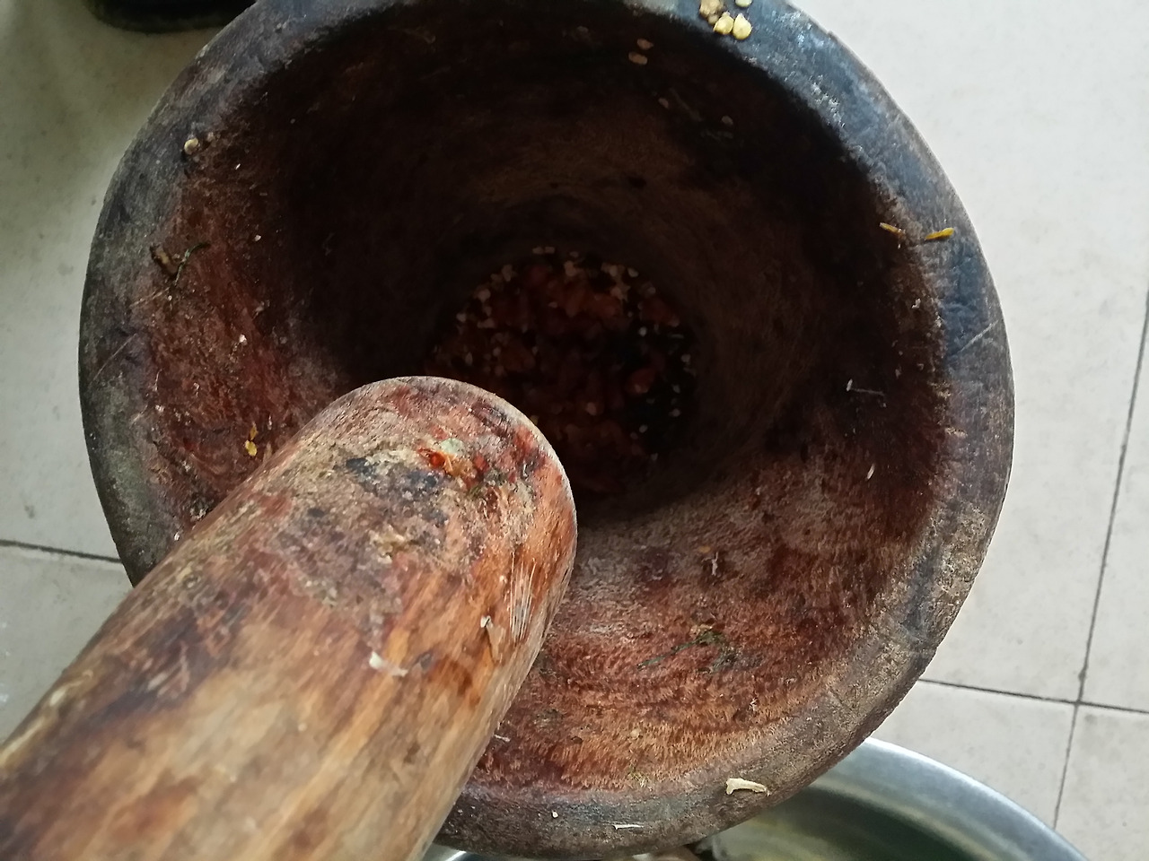 3. 노코스 준비 [노코스 : 후추, 피망, 마늘, 건고추, 네뜨뚜, 양파를 순서대로 넣으며 절구에 찧어준다. ]