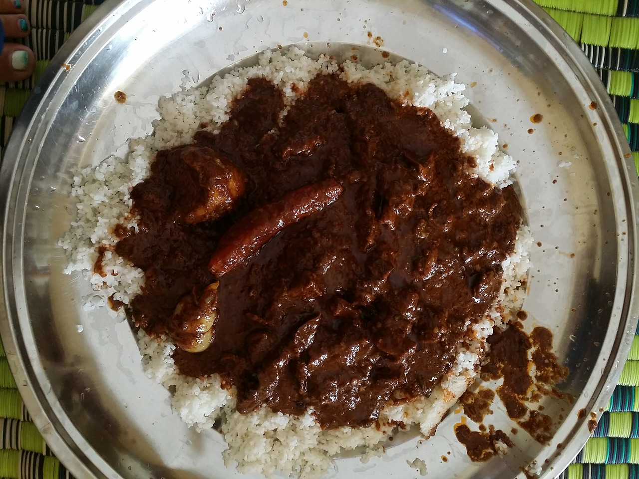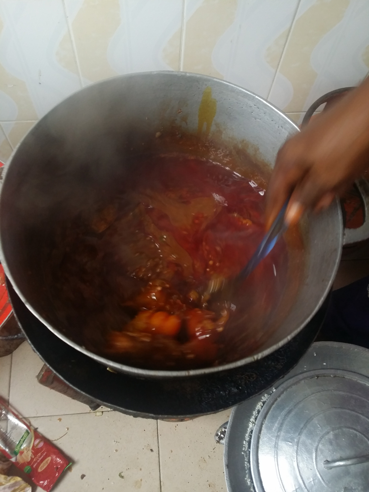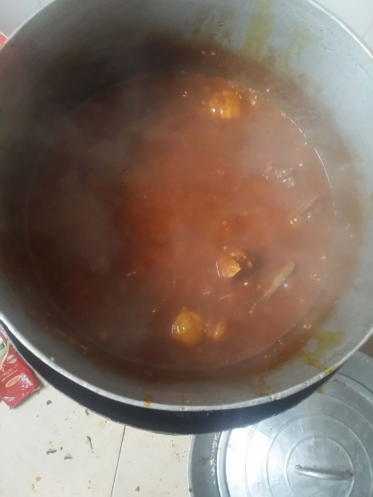 [식재료 : 자꾸떼, 훈제생선, 새우가루, 네뜨뚜(훈제 조개의 일종), 양 다리(육수용), 마늘, 토마토, 간쟈(Kandia, 오크라), 노코스(통후추, 건고추, 마늘, 피망, 네뜨뚜, 양파 절구에 찧은것), 정제되지 않는 팜유,토마토 페이스트 ]