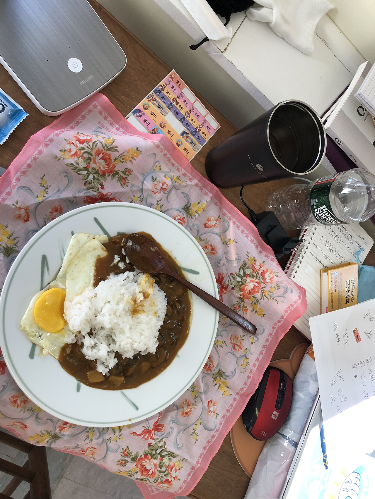 잠을 살짝 설쳤다. 아무래도 새 집이고, 아직 만나보지 못했던 남자룸메가 늦게 들어온 것 같았다. 어제는 일부러 시차를 맞춰려고 9시에 잠이 들었는데 그마저 시차를 이기지 못하고 새벽 2시쯤 깼다. 어쩔 수 없이 일어나서 호텔에서 챙겨온 머핀으로 간단하게 요기를 채우고 블로그에 글을 썼다. 해가 밝고 나서는 카레를 해먹었다. 이게 얼마만의 쌀이더냐!!! 아직 책상 정리가 안된 상태라서 이것 저것 올려둔 채, 식탁보 대신 손수건 깔고 아침식사 ㅋㅋㅋㅋㅋ 요리를 하면서 살짝 느낀건데. 뭐랄까 우리집(한국집)에는 당연히 있었던 것들, 그냥 별거 아닌 가위, 물티슈, 밥그릇... 이런 것들이 여기서는 하나같이 없으니까. 뭐랄까 조금 새로운 기분이었다. 그니까... 있을 때는 모르고 사용했던 것들이 없고 나니 그 자리가 확 느껴졌다고 할까나. 요리 하나 하는데도 엄청 오래 걸린다. 점차 적응하고 나면 빨라지겠거니 생각하며... (내가 가져온 고무장갑은 진짜 신의 한 수 인 듯, 룸메 애들이 설거지 할 때 그냥 맨손으로 한다. 그럼 안된다!!! 손건조하면 큰 일ㅠ 주부습진 걸려도 큰 일...) 아무튼 오늘은 대망의 코로나 검사가 있는 날!
