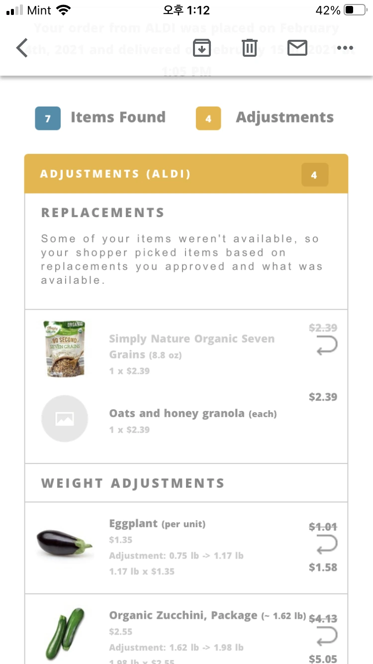 인카는 배송이 되게 빠르기 때문에 상당히 마음에 든다. 오늘 주문하면 내일오는 식으로 쿠팡 와우 같은 배송앱이다. 배달하시는 분의 실수로 한번은 주문한 식자재가 오지 않았는데, 바로 환불을 도와줬고, 한번은 내가 주문한거랑 다른 것들이 와서 입만 삐죽 내밀고 있었는데, 알고보니 내가 대체품을 지정할 수 있었더라! 아무튼 그래서 개인적으로 알디가 집 주변에 있으시다면 유학생 분들!!! 한번 사용해보세요! 홀푸드처럼 엄청 다양한 식자재가 있진 않은데, 이거는 동네마다 다를 것 같아요! 아무튼 저는 요즘 잘 정착해서 알디에서 구입하고 있습니다용!