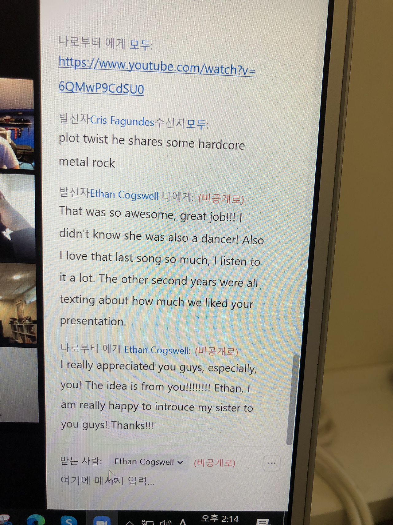 어제는 하루종일 연습도 안하고 그냥 발표 준비만 미친듯이 한 것 같다. 일요일 저녁에 해야 했던 발표 준비를 갑자기 못하게 되서 (룸메 기절 사건ㅠ) 어제는 오로지 발표 준비에만 전념!!!!! 그리고 오늘은 헬과제의 날!!! ㅋㅋㅋㅋ 발표 2개에 녹음 1개 레슨까지... 무슨 정신으로 이걸 다 했는지는 모르겠지만. 사람이 하면 한다고 또 어떻게든 했다 ㅎㅎㅎ.. 아직 유튜브 영상으로 만들진 못했지만 이건 스튜디오 수업때 친구가 보내준 메세지!!!! 2시간 레슨 폭풍으로 받고 난 뒤 오중주 멤버들이랑 같이 저녁 식사했다. ㅎㅅㅎ 첫 행아웃!!!