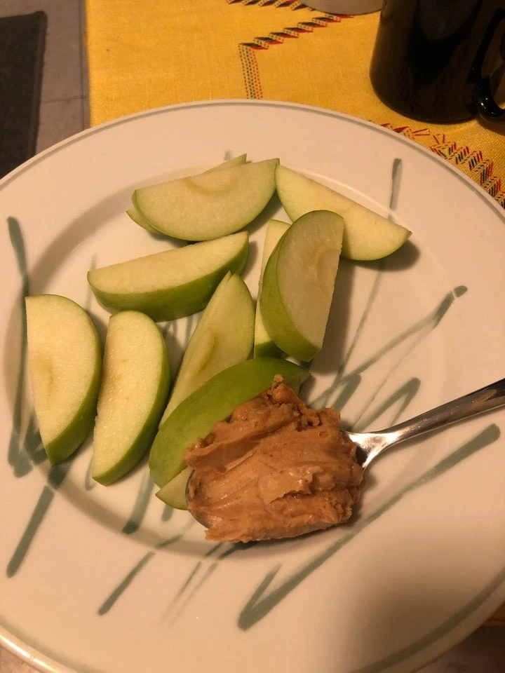오늘 아침은, 모닝 사과에 직접 제조한 피넛소스 ㅋㅋㅋㅋ 땅콩 + 갓 짠 레몬즙 + 메이플 시럽 섞으면 천하무적 소스됩니다용!!! 특히 월남쌈 먹을 때 진짜 맛있으니까 꼭 해드세요!!!
