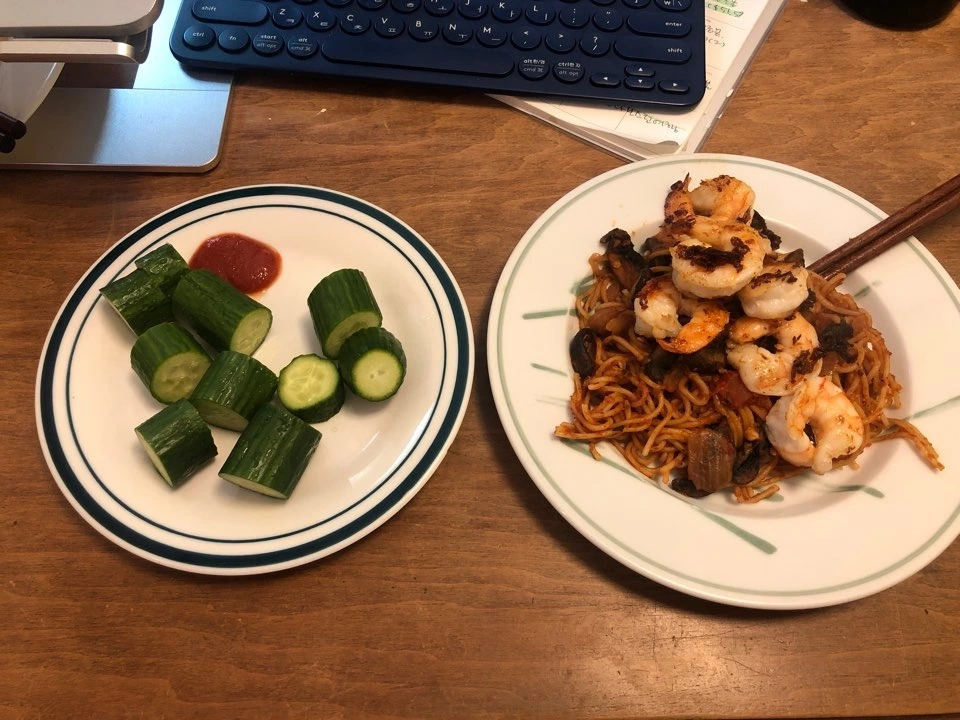 오늘의 아침은, 파스타에 오이! 일주일에 적어도 1번은 먹게 되는게 파스타인거 같다. ㅋㅋㅋ -한번 만들 때 많이 만들어먹고 한 4끼 정도는 파스타로 해결 한다 ㅋㅋㅋㅋ - 그러게, 이 얘기 하니까 얼마전에 지민이랑 연락하면서, 언니 먹는거 보면 한국인 입맛인 본인은 그렇게 못살거 같다라는 말이 생각난당 ㅋㅋㅋ 내가 파스타, 라면 이런 밀가루 음식들을 좋아해서 망정이지, 만약 한식을 좋아했더라면 이곳 생활이 힘들었을 것 같기도 하다 ㅋㅋㅋㅋ 도시가 아니기 때문에 한인마트가 없고 그나마 있는 아시안마켓은 주변이 좀 무서운 동네라서 잘 안가게 되기도 하고... 암튼 이곳에 살기 적합하게 몸이 변한거 같다 ㅋㅋㅋ