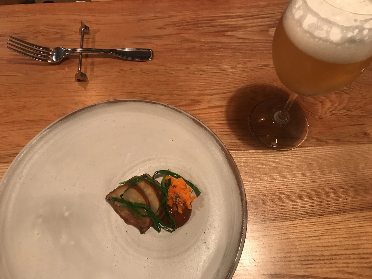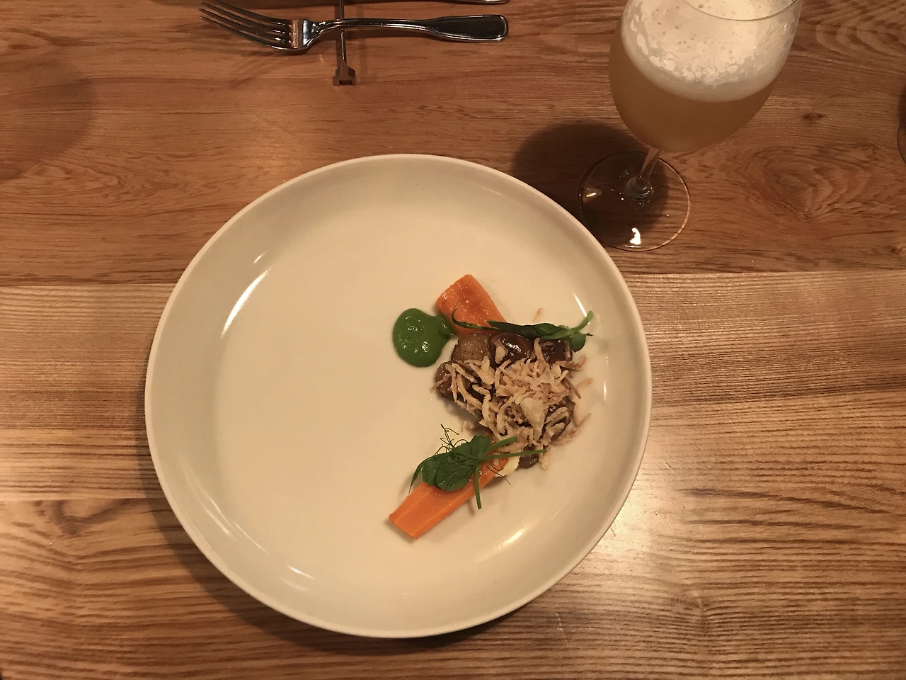 식사의 끝을 향해 갈 때 나온 이 디쉬는 개인적으로 내가 좋아하는 식감과 맛을 갖고 있었다. 표고버섯에서 나오는 풍미와 상큼한 민트 소스가 어우려져 한층 더 풍부하게 해 주었다. 특히 이 디쉬를 통해 나는 당근이 이렇게 맛있는 채소라는 것을 깨달았다.