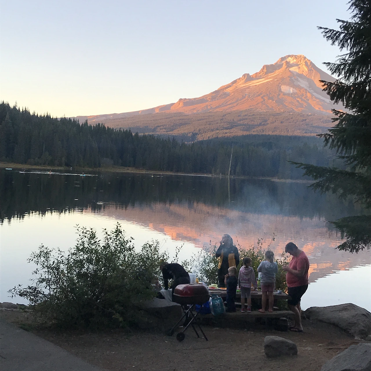 재빠르게 텐트를 치고 트릴리엄 호숫가로 갔다. 국립공원 안에 위치한 캠핑장은 생각보다 커서 한참을 걸어갔다. 고요했고 고요했다. 조용한 길을 따라 숨겨져 있는 캠핑 트레일러나 캠핑용 트럭들이 정말 많이 보였다. 마침내 마운틴 후드 아래 잔잔히 흐르는 호수가 내 눈 앞에 펼쳐졌다.