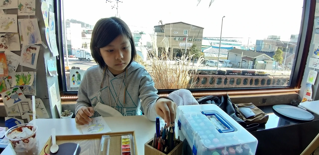 출발하기 며칠 전, 월내역 주변의 카페를 검색해 봤다. 거기까지 갔는데 작은 어항과 등대만 보고 오기엔 좀 그래서 말이다. 찾아보니, <인터스텔라>에 나온 비행선 비스름하게 생긴, 경치 맛 집이라는 <웨이브 온 커피>라는 카페도 있었고, 부두 바로 앞에는 <월내 커피>도 있었다. 딸의 성향 상 바다나 보며 멍 때리는 건 취향에 안 맞을 것 같아서 건물도 화려하고 경치도 좋지만, 그게 다인 <웨이브 온 커피>는 뺐다. <월내 커피>는 영업시간이 두 시까지여서 역시 뺐다. 결국 찾은 것이 <아트카페_잉크>였다. 그림을 그릴 수 있는 카페인 데다가 안에 인테리어가 딸 취향이다 싶었다.