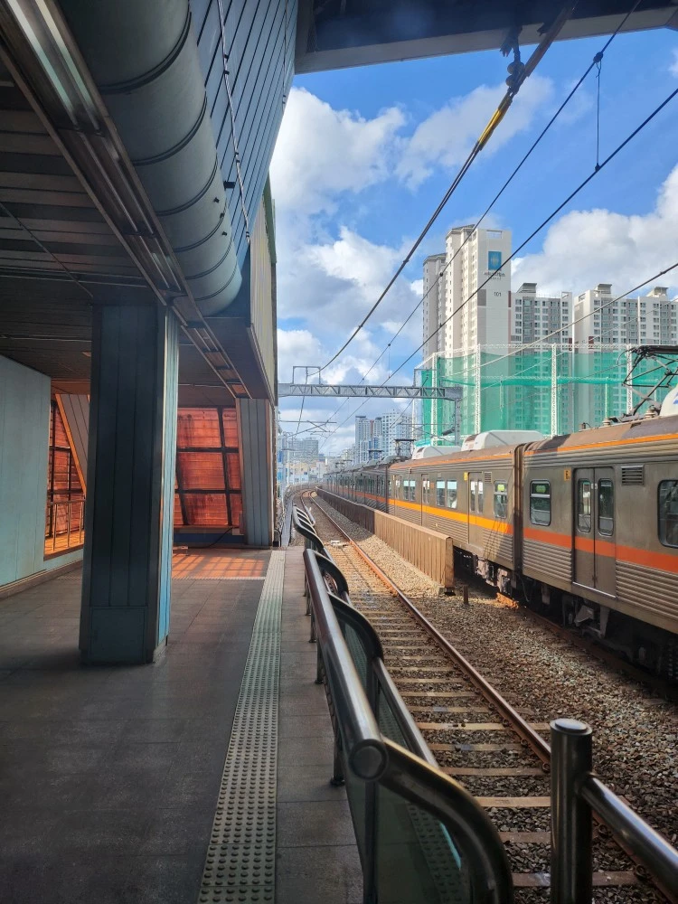 장전역에 올라가 또 사진을 찍었다. 딸에게 플랫폼 끝까지 가보라고 했다. 함께 갔다. 그 끝에선 안전 창문 너머로 오른쪽으로 완만하게 커브를 그리고 있는 고가 철로를 볼 수 있다. 딸은 거기서도 사진을 찍었다. 다른 승객들은 에어컨이 나오는 승객 대기실에 옹기종기 모여 있을 때 철없는 아빠와 에너지 넘치는 딸은 플랫폼을 오가며 사진을 찍었다. 구름과 오래전에 지어져서 특이한 구조를 갖고 있는 장전역을.
