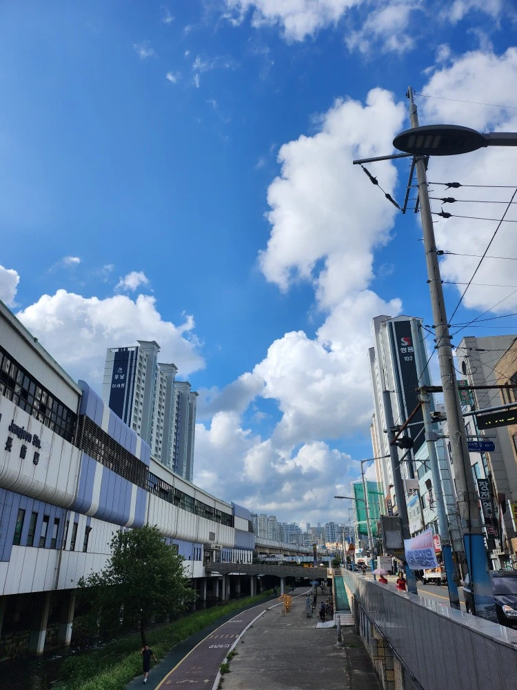 한의원에서 나온 건 네 시가 좀 넘어서였다. 한의원의 계단을 내려오면서 근처 카페에서 음료수를 사 먹는 건 어떨까, 하고 물었다. 딸이 좋아하는 음료는 대형 플라스틱 컵에 이런저런 단 것들이 잔뜩 들어간 무슨 무슨 프라푸치노였다. 그걸 들고 지하철을 탈 수는 없으니 오다가 본 슈퍼에서 간단한 음료 한 잔을 하자고 했다. 딸은 탄산수를, 난 논알코올 맥주를 샀다. 온천천 위에 올라 선 장전역은 아주 짧은 다리를 건너 들어간다. 우린 그 다리 위에서 온천천과 장전역과 구름을 보며 음료를 마셨고, 틈틈이 사진을 찍었다.