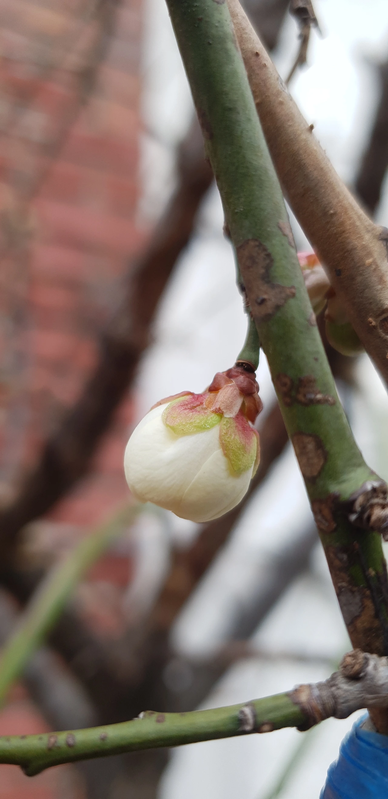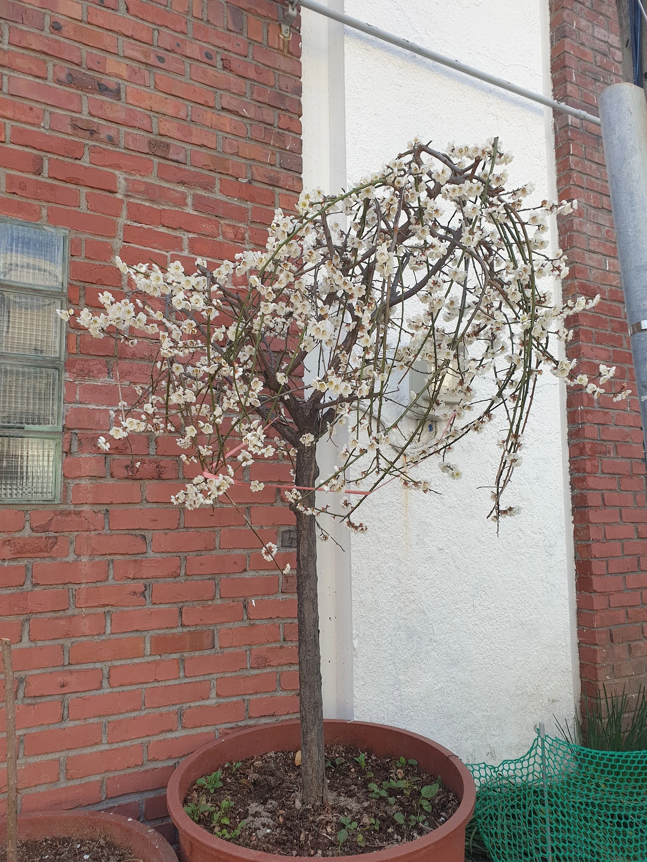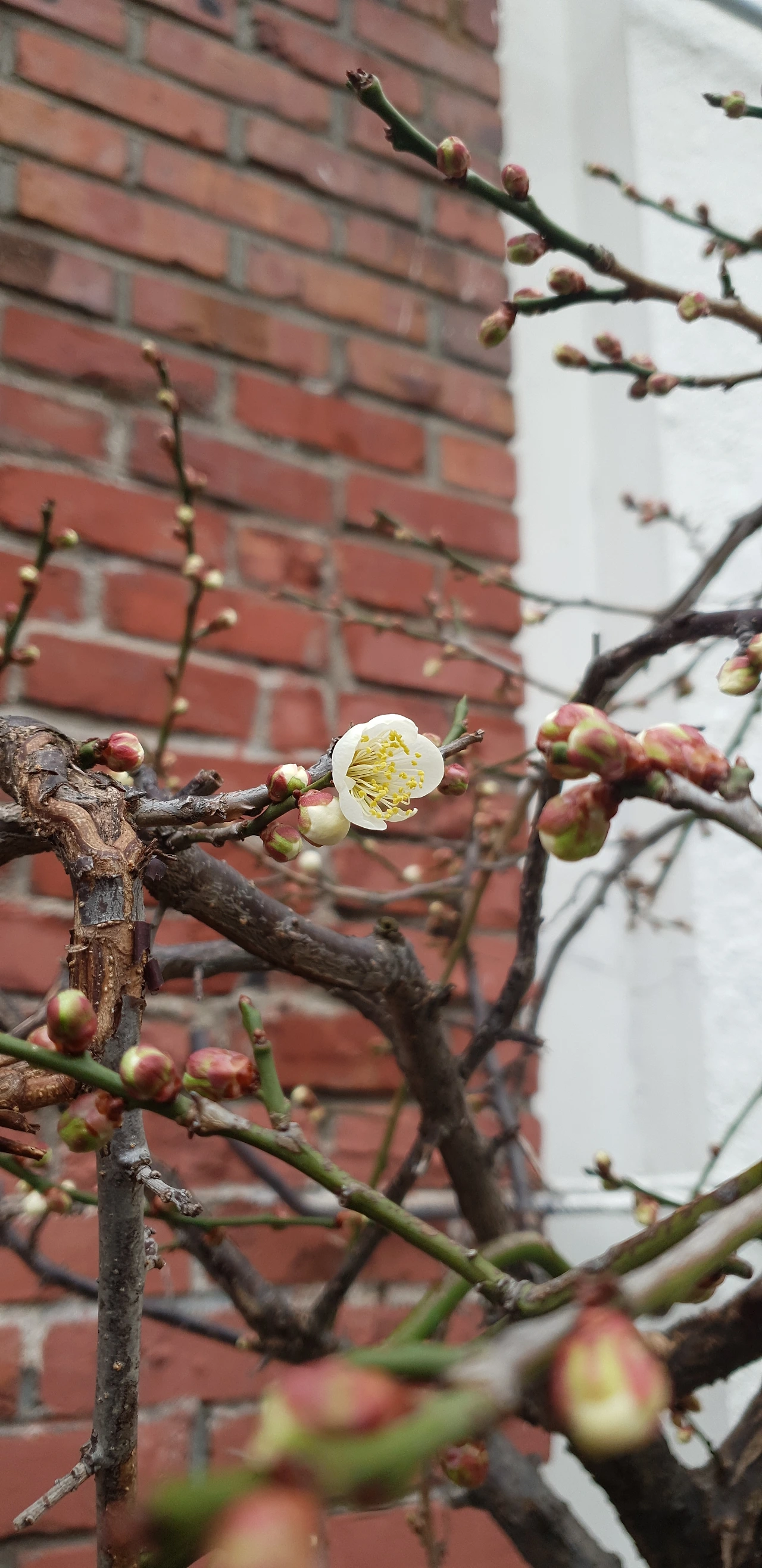 앞서 다른 글에 소개했던 바다채송화가 피어 있던 빨간 벽돌집은 같은 모양의 세 채의 집 중 가운데 집이다. 첫 번째 집은 특이하게도 작은 마당으로 들어가는 입구에 아치형의 지지대를 설치해서 샤인 머스캣과 색깔이 똑같은 포도를 키운다. 두 번째 집 화단엔 바다 채송화와 술붓꽃을 키웠지만 요즘엔 수선화를 키운다. 세 번째 집은 커다란 김장용 고무 들통에 빼빼 마른나무 하나를, 그야말로 꽂아놓고 있다. 처음 이사 왔을 땐 죽은 나무인 줄 알았다. 영락없는 꼬부랑 할머니의 지팡이 같았기 때문이다. 그러던 어느 날, 그 나무에 꽃이 폈다. 아직 2월 말인데, 여전히 추운데, 하얀 꽃이 듬성듬성 폈다. 매화다.