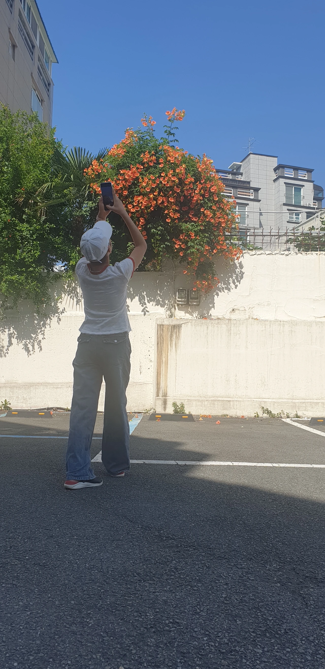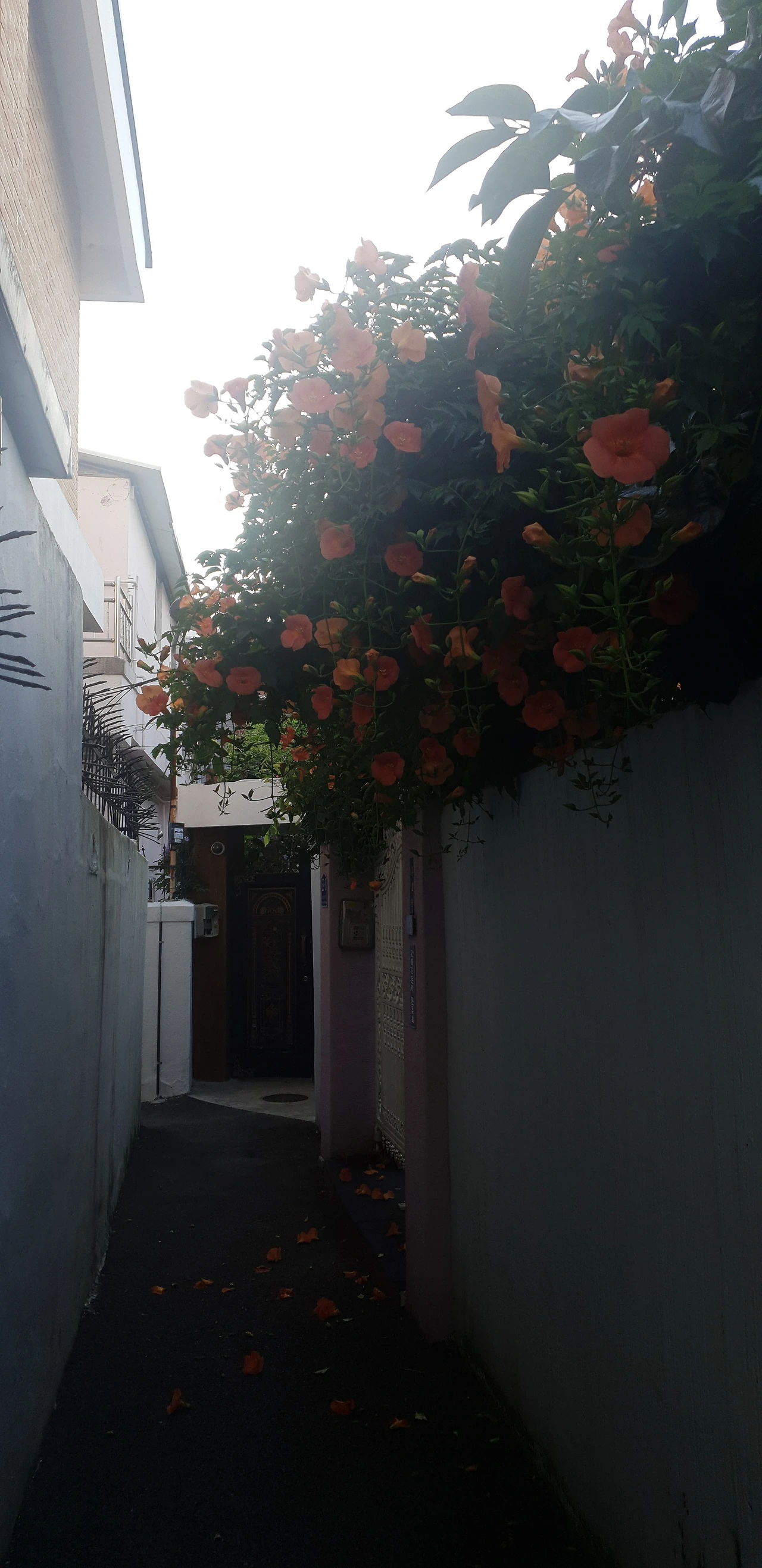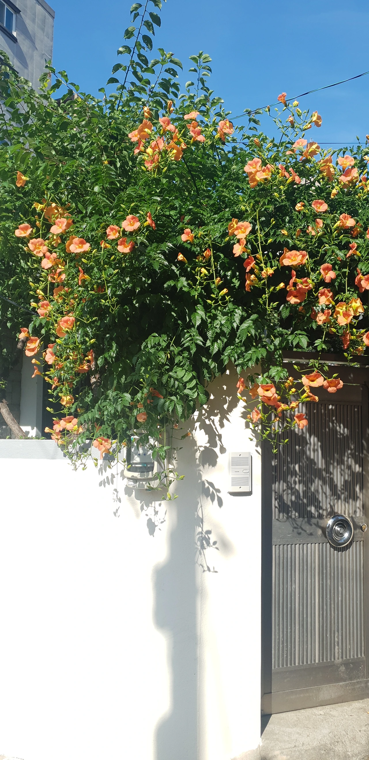 딸과 함께 동네와 인근 공원에 핀 꽃을 보러 다니기 시작한 후 여름마다 이 꽃을 기다려 봤다. 마침 앞집 주인장이 이 꽃을 잘 키워 여름이면 담장 밖으로 오렌지색 능소화가 쏟아져 내렸다. 덩굴장미처럼 뿌리와 줄기의 주인은 집 안에 있으나 꽃의 호사는 이웃이 누린다. 감사한 일이다. 이것도 일종의 보시로 봐야 하지 않을까? 능소화의 덩굴은 무성해질수록 바닥을 향하는데 그 줄기에 색소폰처럼 매달려 피는 꽃들은 태양을 향하여 고개를 든다. 능소화가 핀 담장에 서서 사진을 찍으면 꽃은 꽃대로, 사람은 사람대로 아름답게 담기는 이유다.